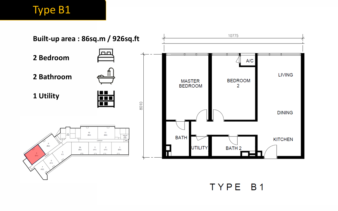 | TYPE B1 | 926 SQFT | RM 2130 PER SQFT | RM 1,973,000 | 2 | 2 | ||