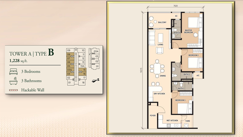 | Type B | 1228 SQFT | RM 669 PER SQFT | RM 821,800 | 3 | 3 | 2-3 | |