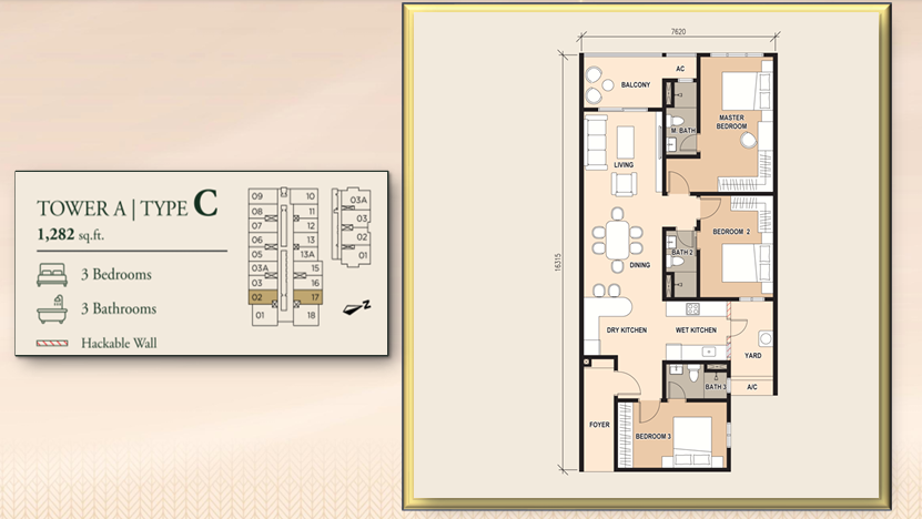 | Type C | 1282 SQFT | RM 704 PER SQFT | RM 903,800 | 3 | 3 | 2-3 |