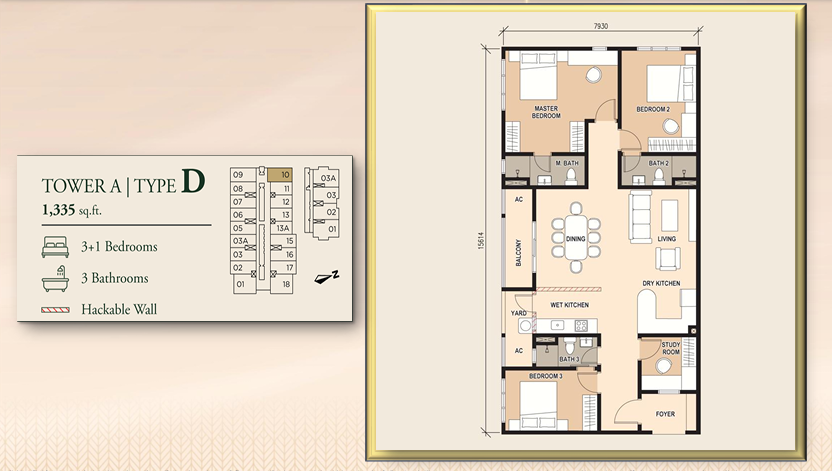 | Type D | 1335 SQFT | RM 695 PER SQFT | RM 928,800 | 3 | 3 | 2-3 | |