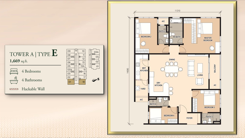 | Type E | 1669 SQFT | RM 620 PER SQFT | RM 1,034,800 | 4 | 4 | 2-3 | |