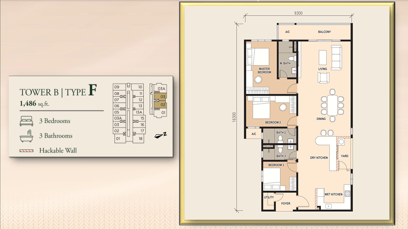 | Type F | 1486 SQFT | RM 660 PER SQFT | RM 980,800 | 3 | 3 | 2-3 | |