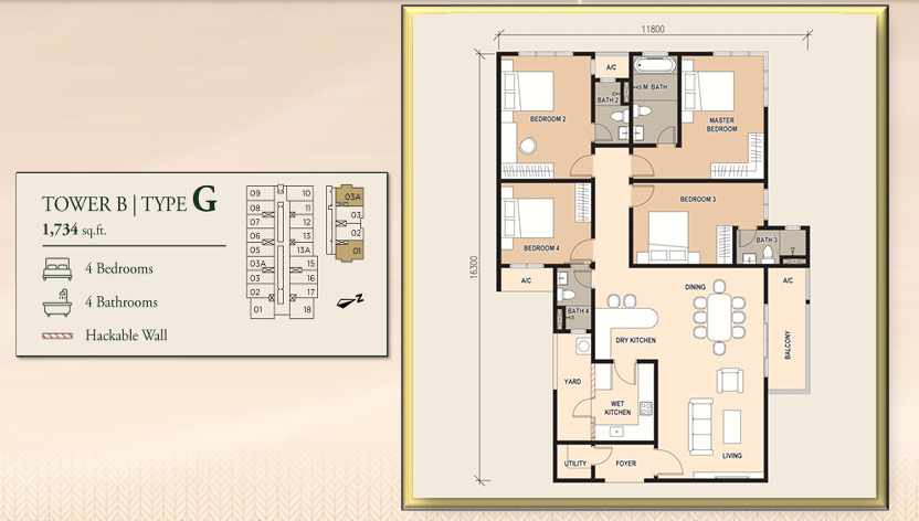 | Type G | 1734 SQFT | RM 728 PER SQFT | RM 1,263,800 | 4 | 4 | 2-3 | |
