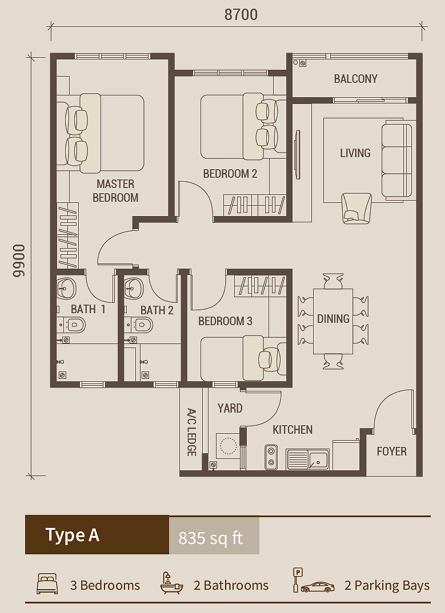 | Type A | 835 SQFT | RM 886 PER SQFT | RM 740,000 | 3 | 2 | 2 | |